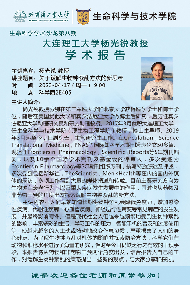 报告人简介:杨光锐教授在北京大学获得博士学位,随后在美国犹他大学和宾夕法尼亚大学做博士后研究,后历任宾夕法尼亚大学助理研究员和研究助理教授。2017年3月就职大连理工大学,任永利集团88304官网(现生物工程学院)教授,博士生导师。2019年3月起至今,任副院长,主管研究生工作。在Circulation,Science Translational Medicine,PNAS等国际知名学术期刊发表论文50多篇。现担任Frontiersin Pharmacology,Scientific Reports等SCI期刊编委,以及10余个国际学术期刊及基金会的评审人,多次受邀为Frontiersin Pharmacology等SCI期刊组织专刊,撰写特邀综述及评述,多次受到包括新华社,TheScientist,Men'sHealth等在内的国内外媒体的采访,多项工作得到大量的媒体报道和转载。目前主要研究方向为生物钟在衰老行为,以及重大疾病发生发展中的作用,同时也从药物及非药物干预的角度出发探索缓解生物钟紊乱的新方法。